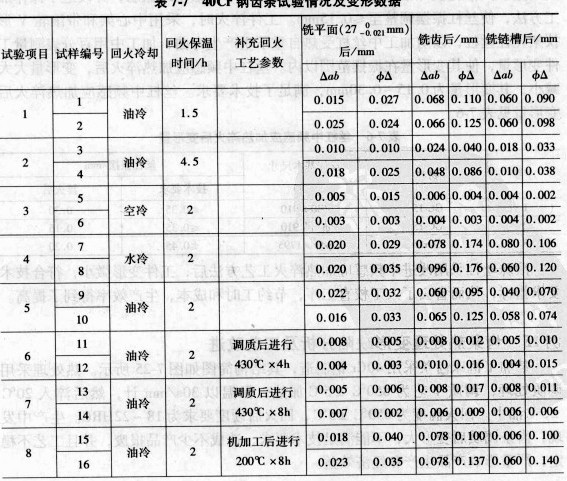 40Cr鋼齒條試驗情況與變形數(shù)據(jù)如表7-7所示。從表7|7試驗數(shù)據(jù)分析可以看出,造成工件在冷加工中變形的主要原因是調(diào)質(zhì)熱處理中產(chǎn)生的熱應(yīng)力。為消除工件熱處理中熱應(yīng)力危害,可采取以下工藝改進(jìn)措施: